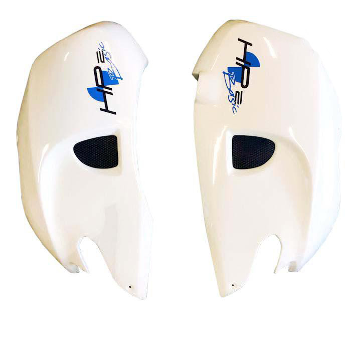 Paire de housses spéciales de résine et de réservoir MAT avec renforts en fibre de carbone, finition et graphisme blancs ALPINEWHITE, remplacés par le plastique d'origine, donnent à la moto un look vintage fantastique. Très légers, ils peuvent être assemblés en quelques minutes, ils sont fournis peints et perforés, complétés par des grilles en aluminium. Sur le côté gauche, il y a une grande prise d'air pour le radiateur d'origine.