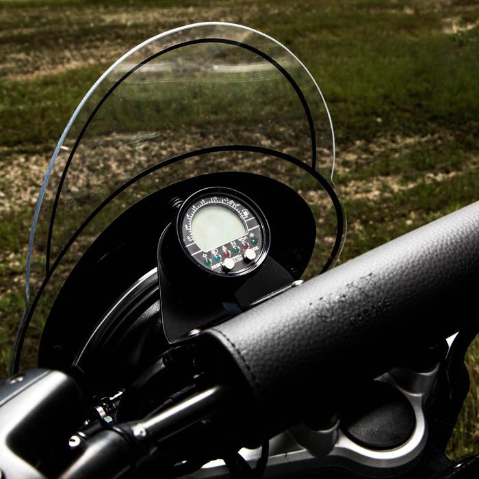Ordinateur avec corps et anneau noir Dimensions: diamètre 73 mm - hauteur 41 mm. Tachymètre et indicateur de vitesse jusqu'à 300 km / h; odomètres partiels et totaux, temps, vitesse maximale, temps de parcours partiel et total; Affichage LCD avec deux lignes numériques et un graphique à barres analogique pour le compte-tours; Écran LCD avec fond LED bleu; Mémorisation du kilométrage et de la distance totale; Affichage de l'heure même lorsque l'appareil est éteint; Réglage de la circonférence de la roue adaptable à tous les types de roues (largeur de 1 à 3 999 mm); Unité de mesure de vitesse en miles ou kilomètres; Coque imperméable; Indicateurs de direction, feux, pression d'huile, indicateur de neutre et anomalies moteur; Jauge de carburant graphique. Inclus dans le package, vous trouverez un capteur de vitesse; Kit de montage et support tous en aluminium inoxydable; Câblage avec connexions étain étanches; Instructions de montage et manuel.