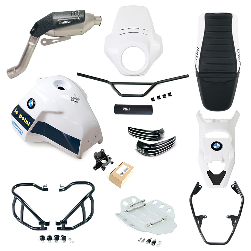 Le partenariat entre Unit Garage et Akrapovič a donné naissance à un système d'échappement alliant la technologie Akrapovič, le design Unit Garage et une esthétique inspirée des motos BMW Dakar des années 1980. Le silencieux, fabriqué artisanalement en alliage de titane haut de gamme avec un revêtement en carbone, ne pèse que 2,1 kg ! Outre sa légèreté, cet échappement offre un gain de puissance et de couple, ainsi qu'une sonorité plus grave et sportive. Compatible avec les fixations d'origine de la moto, son installation est simple et ne nécessite aucune modification ni reprogrammation du calculateur.