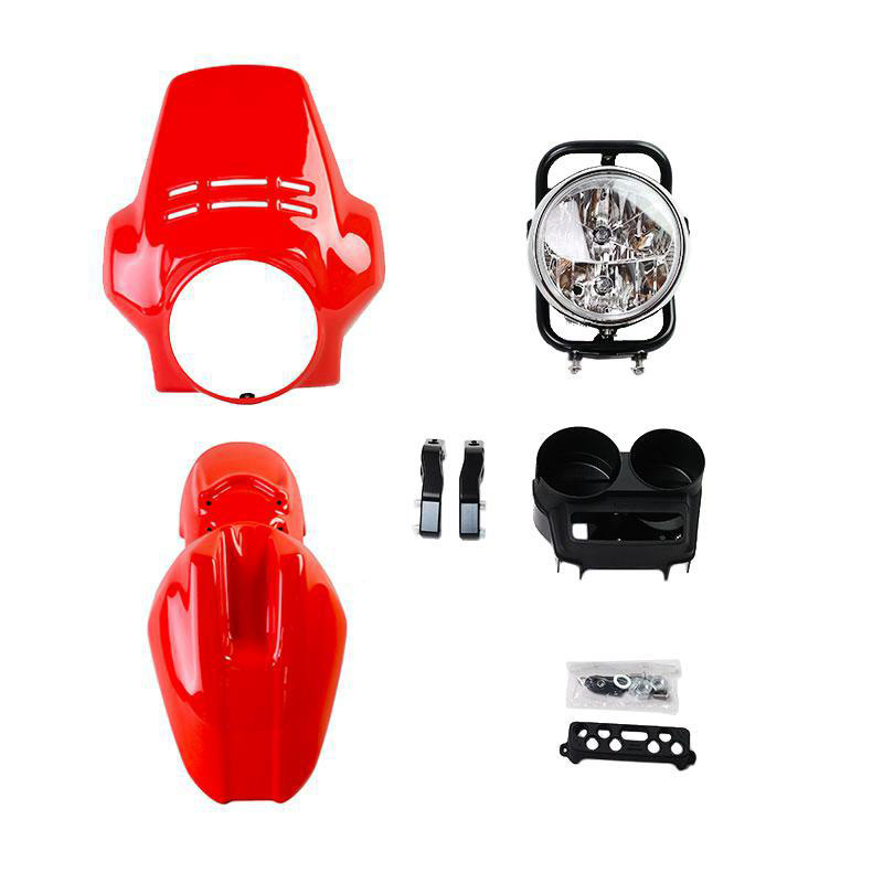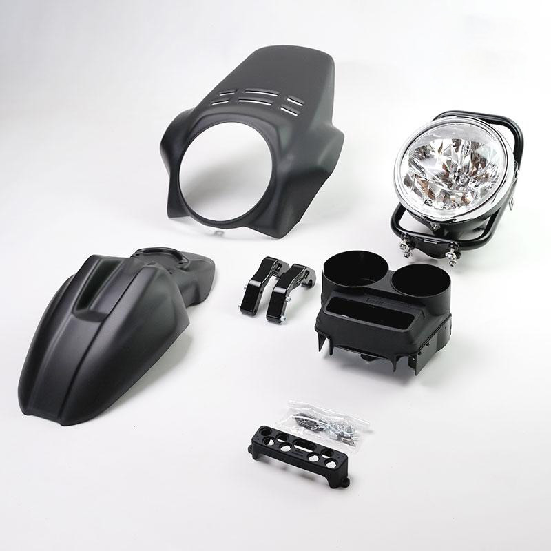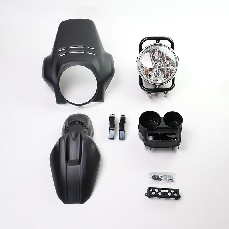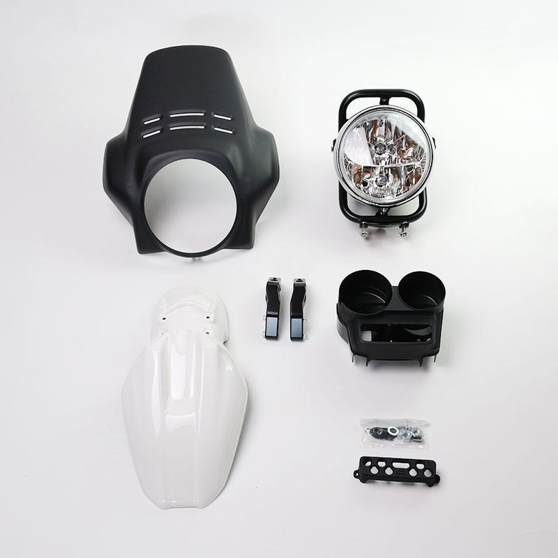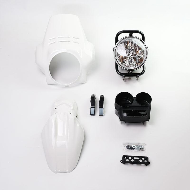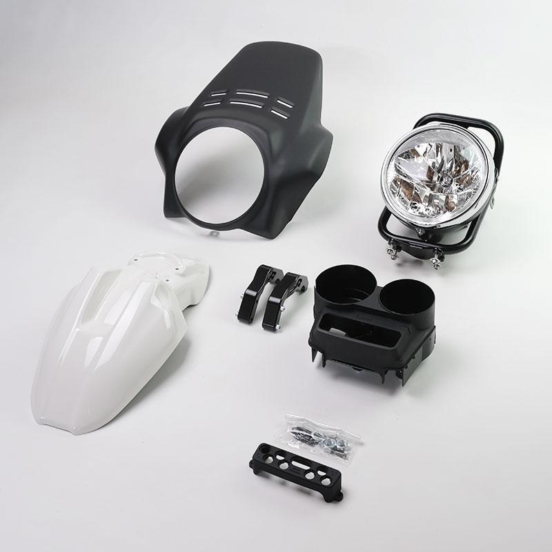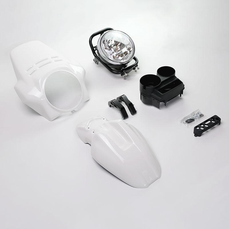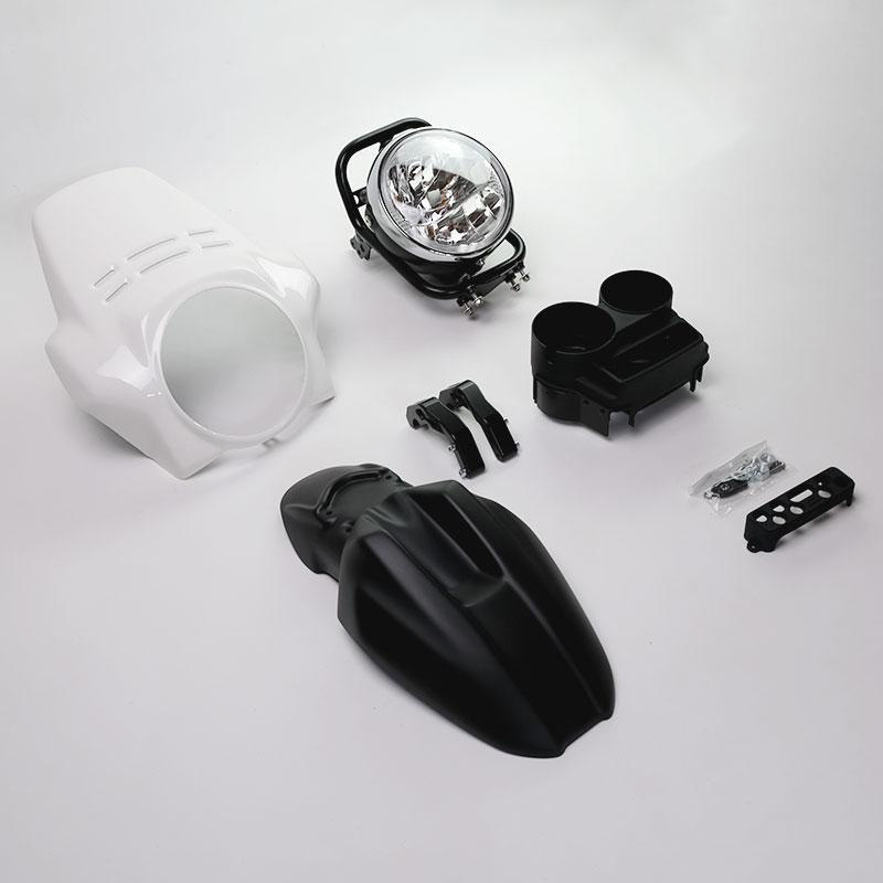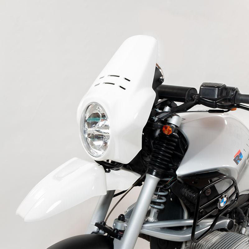 Le kit propose le garde-boue avant en deux couleurs. Il rappelle les lignes de la pointe GS des années 80, avec finition Alpinewhite ou Matt Black ou Red; il peut être monté simplement en le fixant dans les fixations appropriées du cadre de phare Cod.1216.