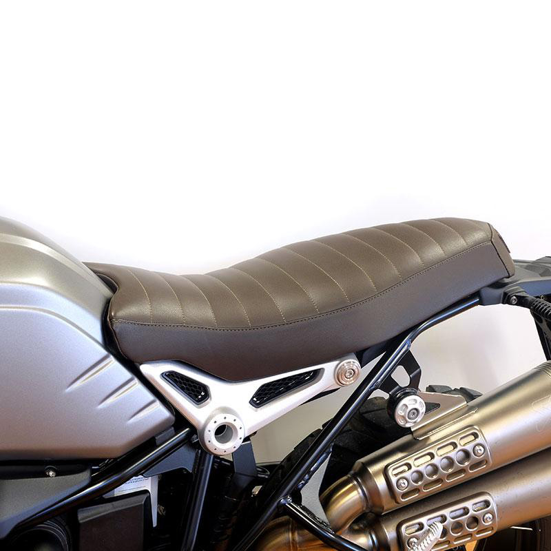 Nous avons sélectionné les meilleures tanneries et choisi des cuirs d'origine italienne et non traités au pentachlorophénol. Fait à la main et cousu avec du fil de coton. Très légers, avec un nouveau fond dédié au nineT, ils se fixent dans la même position que ceux d'origine et peuvent être montés sans aucune modification sur la moto.