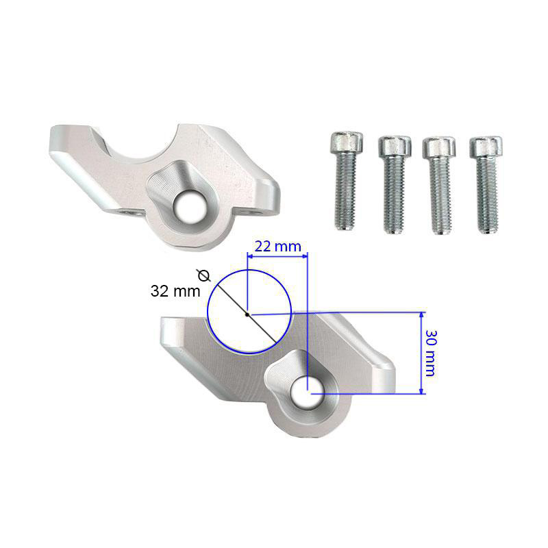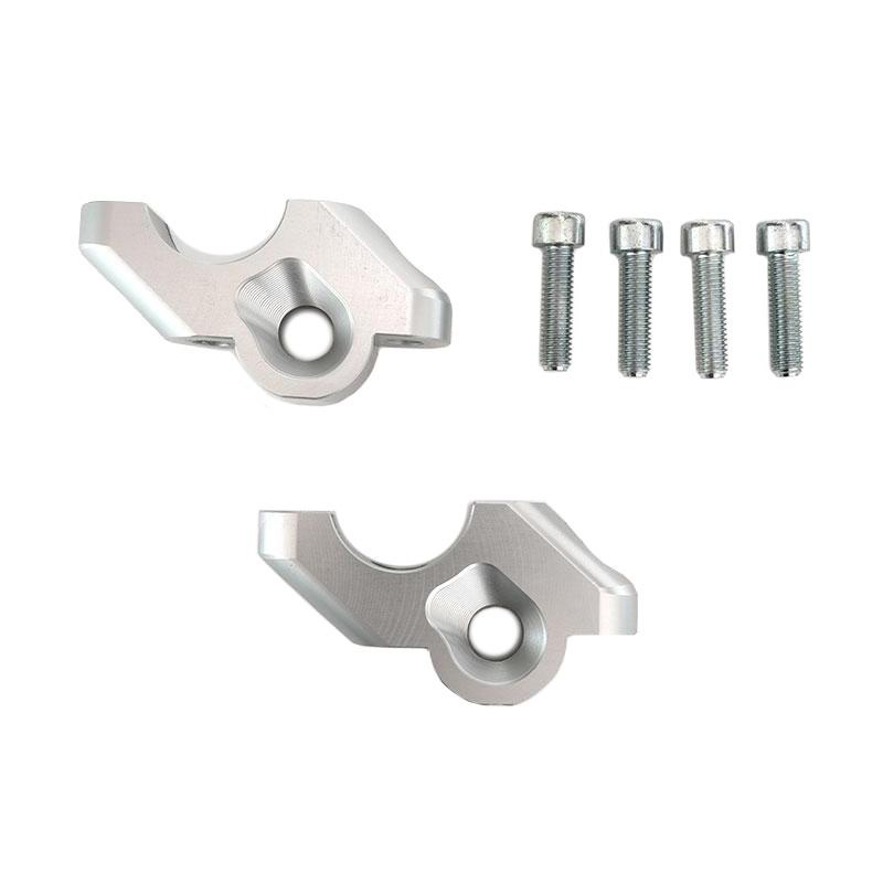 Des élévateurs de guidon spéciaux conçus et fabriqués par nous à la CNC, usinés à partir d’un alliage d’aluminium solide au fini argent.