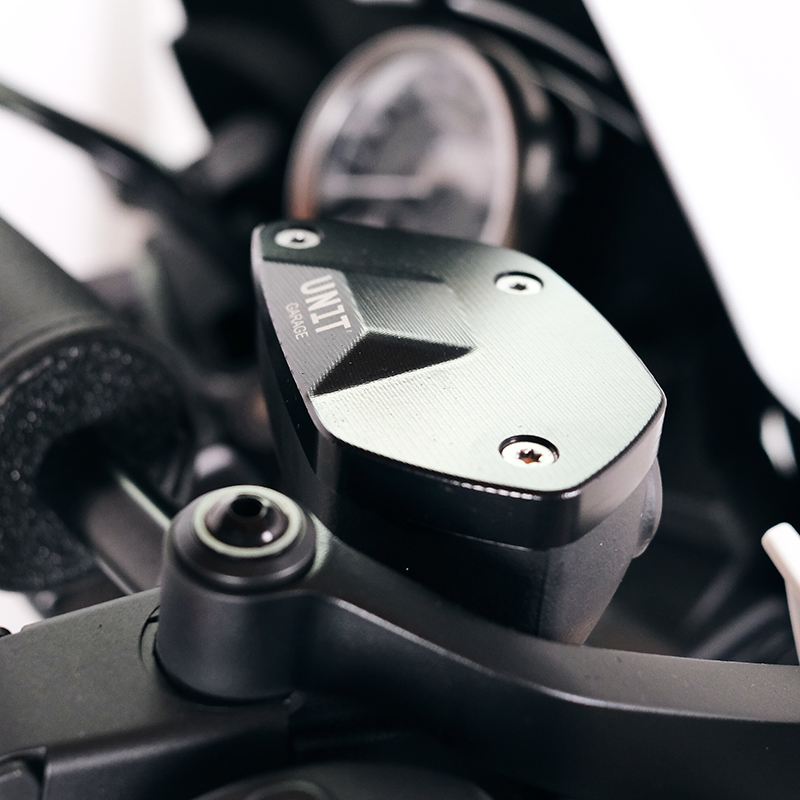 Paire de bouchons de réservoir d'huile de frein et d'embrayage usinés à partir de CNC massif. Ils se montent sans aucune modification et remplacent ceux d'origine, les rendant plus protecteurs et élégants.
