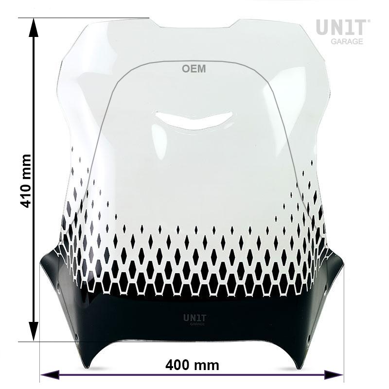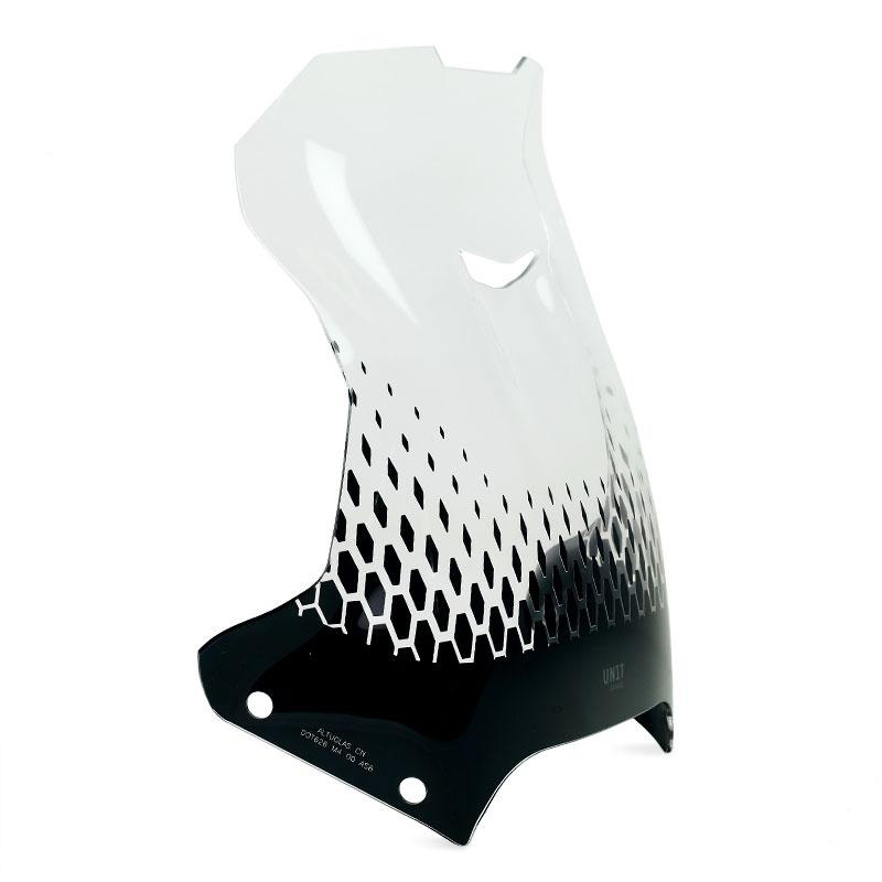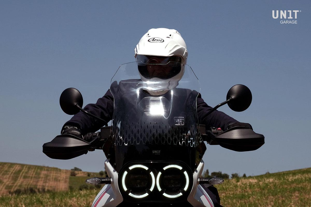 Carénage DesertX Edi Touring conçu pour être monté sans aucune modification en réutilisant les supports d'origine. L'ergonomie du carénage est absolument personnelle et nous l'avons développé en différentes formes, tailles et transparences, chacune adaptée à différentes hauteurs et attentes. Dans cette version, la plus grande et la plus protectrice des trois propositions, nous avons augmenté la taille par rapport à l'original sans compromettre le design. Plus de protection pour ceux qui veulent affronter de longs trajets et avec l'ajout d'une prise d'air centrale qui dirige le flux d'air de manière plus contrôlée. Essayer c'est croire, le résultat est fantastique tant au niveau du design que du confort ! Fabriqué en PMMA de 4 mm d'épaisseur, il est disponible à la fois transparent et fumé, tous deux sérigraphiés.