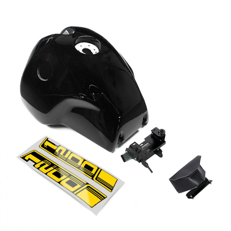 Le réservoir en nylon est fourni peint en noir brillant avec des autocollants. Le réservoir est plus court pour pouvoir avancer et mieux charger la partie avant. Vous n'aurez plus l'étrange sensation d'éloignement du guidon, les sensations de conduite changent pour le mieux. Le bouchon du réservoir, la pompe à essence et le filtre à charbon actif (canester) restent ceux d'origine de votre moto. L'indicateur de réserve fonctionnera toujours, vous n'aurez rien à trafiquer, le kit est totalement réversible. Tous les supports de fixation du réservoir sont fournis dans le kit.