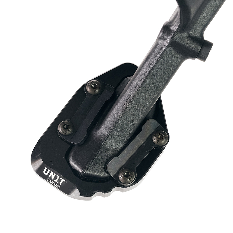 La surface d'appui du support d'origine est plutôt médiocre. Sur surfaces meubles ou asphalte chaud, cette plaque Ergal usinée dans un matériau solide permet un appui sécuritaire. Anodisé noir antioxydant avec gravure et logo. Il s'assemble en quelques minutes.