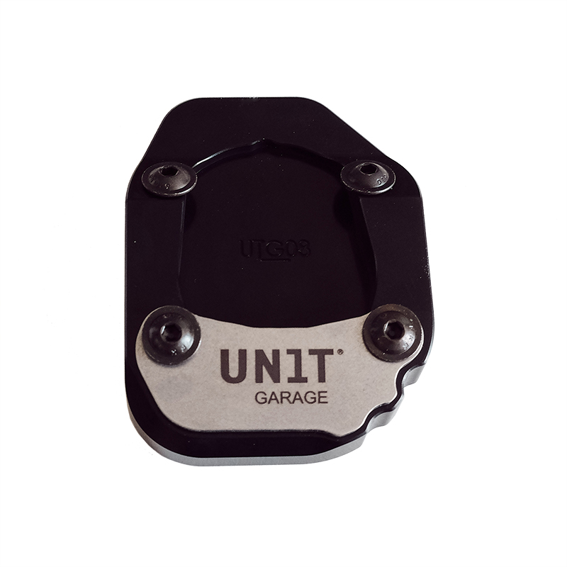 La surface d'appui du support d'origine est plutôt réduite. Sur sol meuble ou asphalte chaud, cette plaque en Ergal usiné assure une stabilité optimale. Anodisée noire, elle est livrée avec une plaque en acier inoxydable avec logo.