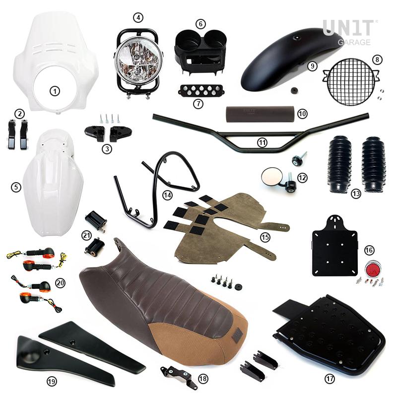 Fabriqué en acier traité avec des peintures en poudre à haute résistance. Il se monte facilement sur le Riser Code : 1555 et permet le logement du feu avant, du garde-boue haut, des clignotants d'origine et des saute-vent en option.