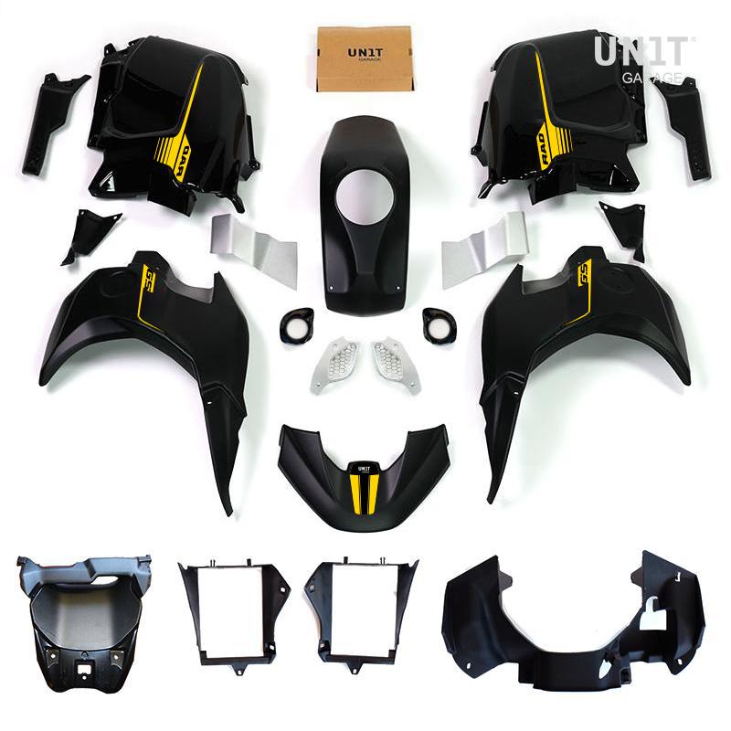 Redessine tout l'avant du vélo en le rendant plus étroit et effilé. Sur les côtés, il y a le logement du logo original R1200 GS qui peut être retiré de votre vélo. Deux autocollants prédécoupés sont fournis pour remplacer ceux des logos que vous allez démonter.