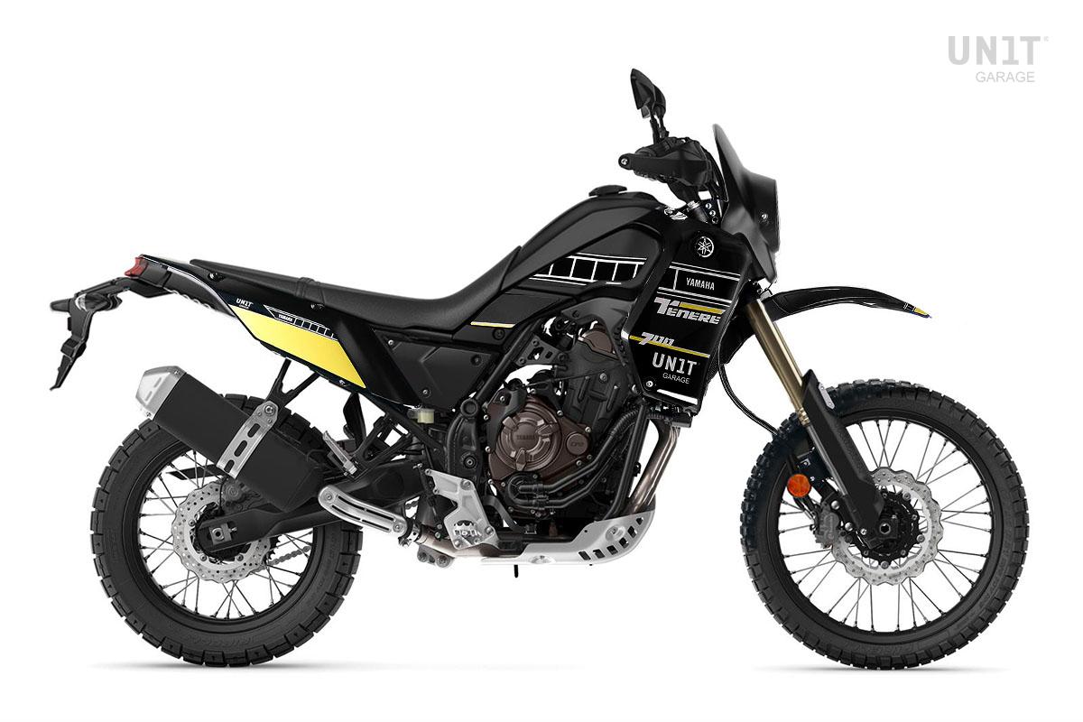NB: Le kit est compatible avec les modèles Ténérè 700 jusqu'à 2024, World Raid exclu. Sur les côtés vous pourrez réutiliser le logo original, vous recevrez un nouvel adhésif double face inclus dans le kit.