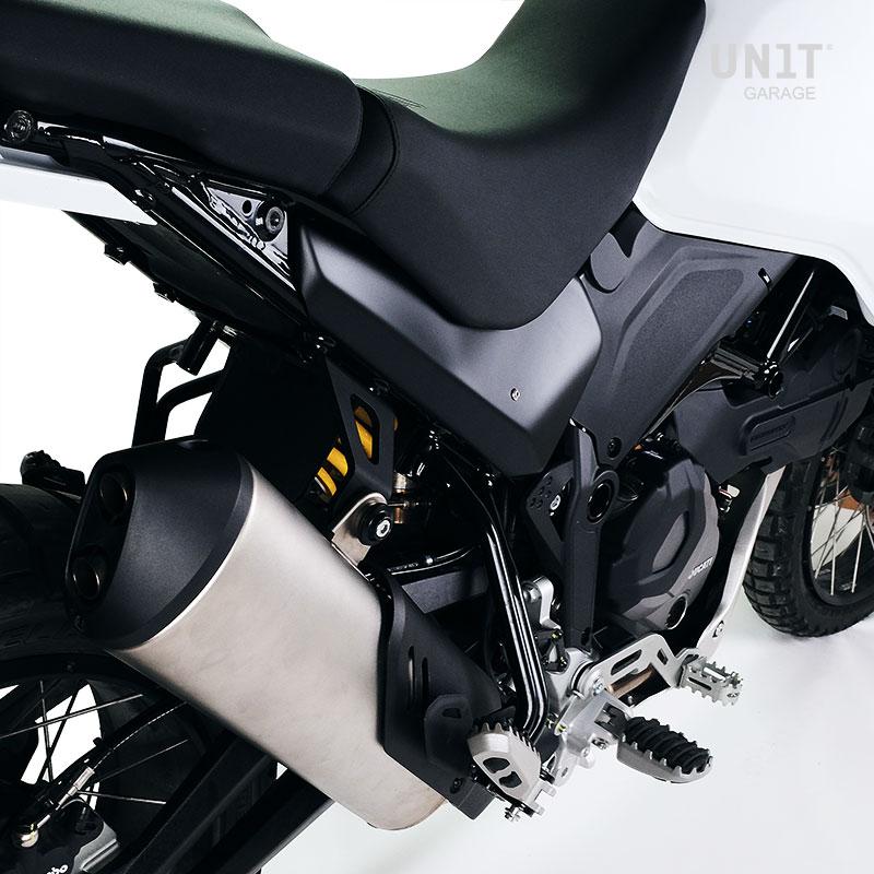 La Ducati DesertX est un peu nue dans la zone arrière, c'est pourquoi nous avons développé ces accessoires avec des graphismes dédiés qui reprennent les couleurs d'origine. Paire de panneaux latéraux très légers en ABS. Ils sont livrés peints pour correspondre aux couleurs d'origine ou neutres en ABS noir (autocollants également vendus séparément code 3913 et 3914). Ils se montent très facilement avec le kit de vis fourni, ils finissent et complètent l'arrière du vélo, le rendant très esthétique. Ils se libèrent par pression pour ouvrir la selle ou régler l'amortisseur arrière.