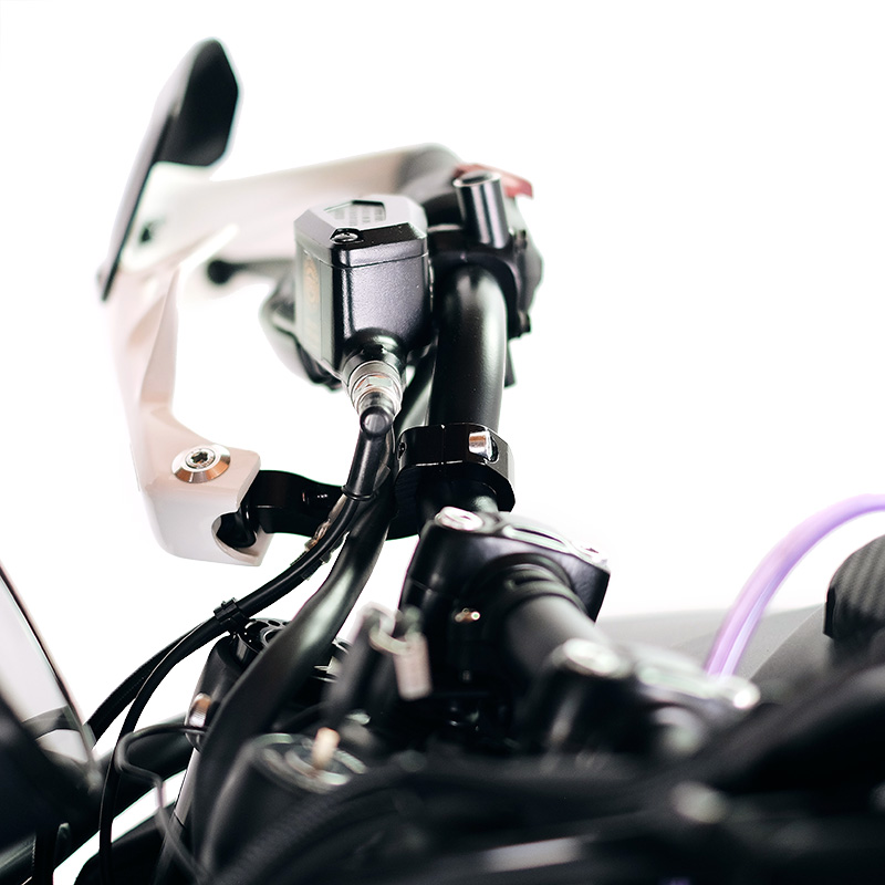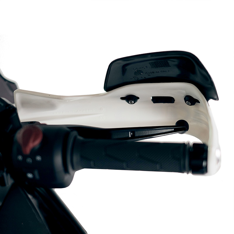 Protège-mains Rallye classiques et bracelets anticorodal pour fixation du protège-mains au guidon, avec support dédié.