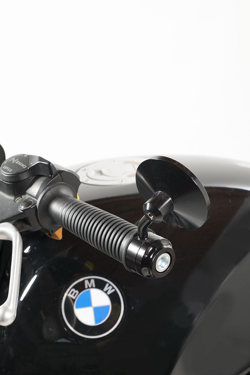 Miroir en aluminium anodisé noir construit ad-hoc. Réalisés avec commande numérique CNC, les bornes dans ce cas sont fournies par paires. Les rétroviseurs sont toujours un problème pour le look du vélo, que dans ce cas nous avons résolu de manière très minimale. Ils sont livrés complets avec embouts en aluminium et vis de fixation (ils ne peuvent pas être équipés d'embouts de guidon en plastique)