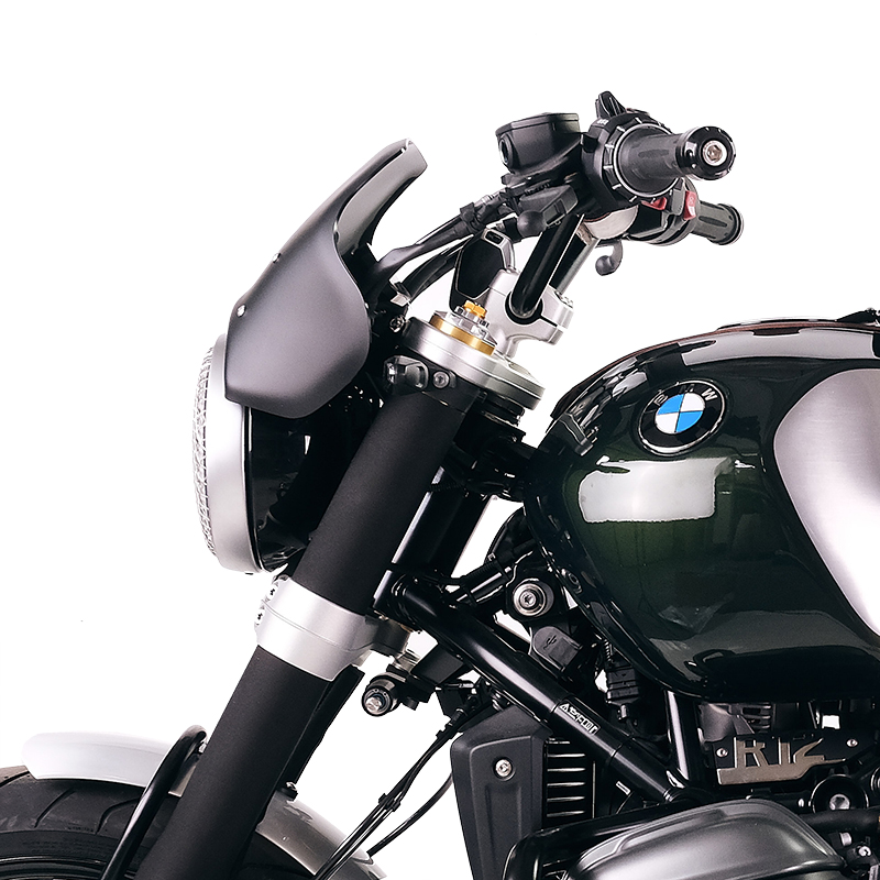 Pour la BMW R12 nineTe R12, nous souhaitions un guidon « Old School » avec traverse et diamètre constant (22 mm). La moto gagne en agressivité grâce à une position de conduite plus détendue. Fabriqué en acier avec finition époxy noir mat, il est livré avec tout le nécessaire pour le montage sur les rehausseurs et les commandes d'origine. Aucune modification des câbles ou des durites de frein n'est requise.