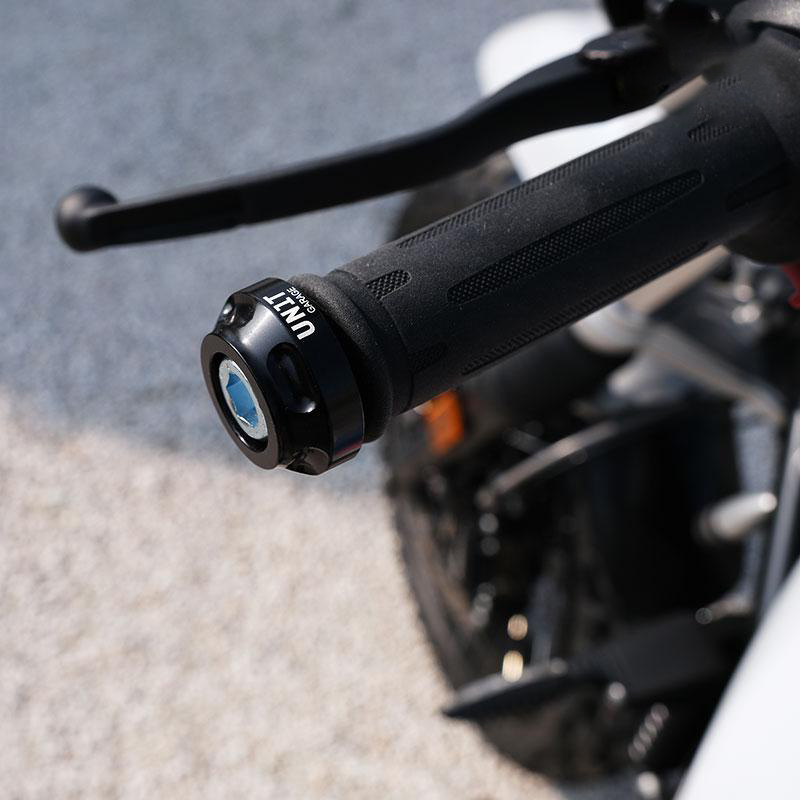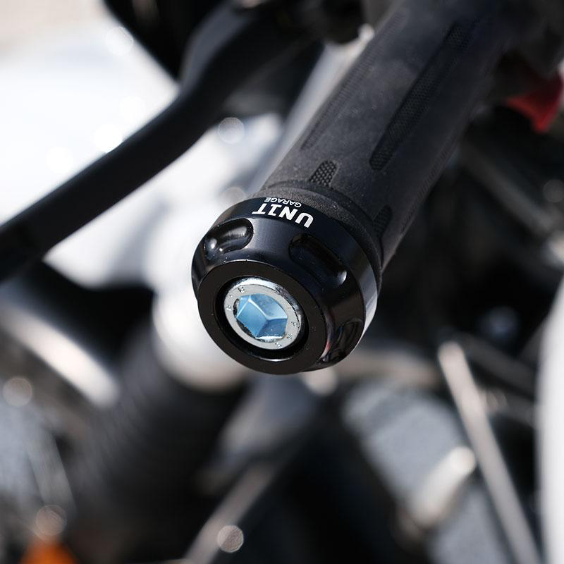 Paire d'embouts de guidon fabriqués à commande numérique avec finition noire brillante et logo Unit garage. Les deux vis M12 avec extension de fixation relative sont incluses.