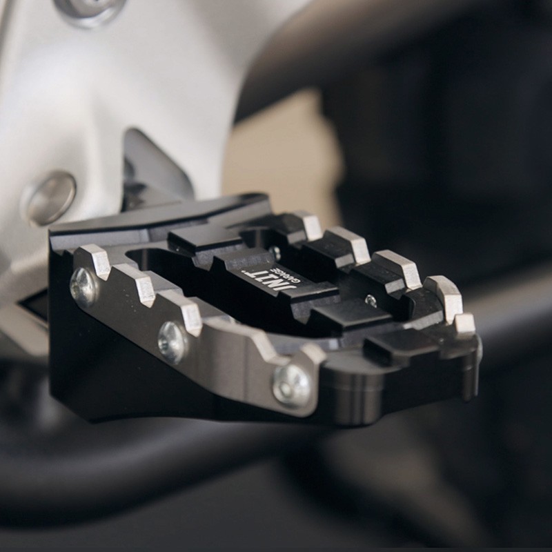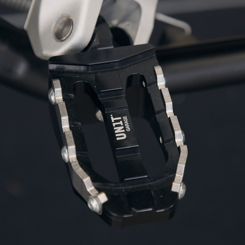 Paire de repose-pieds usinés CNC massif avec inserts en acier inoxydable. Ils améliorent considérablement le maintien de la botte en tout-terrain, notamment lorsque l'on roule debout, de plus ces repose-pieds sont réglables car ils peuvent pivoter à 30 degrés permettant à chaque pilote une excellente ergonomie.