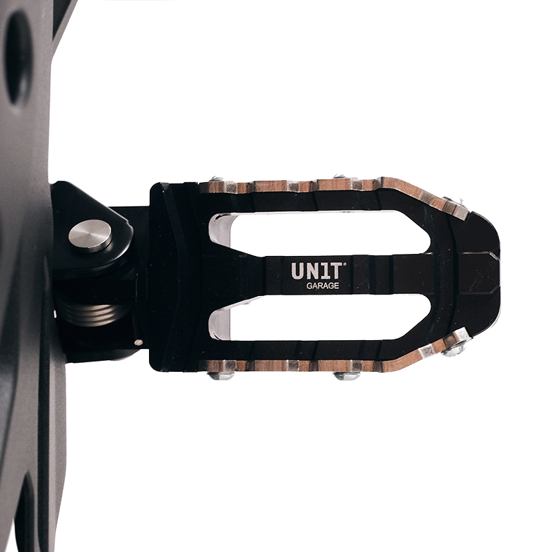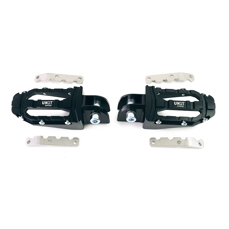 Paire de repose-pieds usinés CNC massif avec inserts en acier inoxydable. Ils améliorent considérablement le maintien de la botte en tout-terrain, notamment lorsque l'on roule debout, de plus ces repose-pieds sont réglables car ils peuvent pivoter à 30 degrés permettant à chaque pilote une excellente ergonomie.