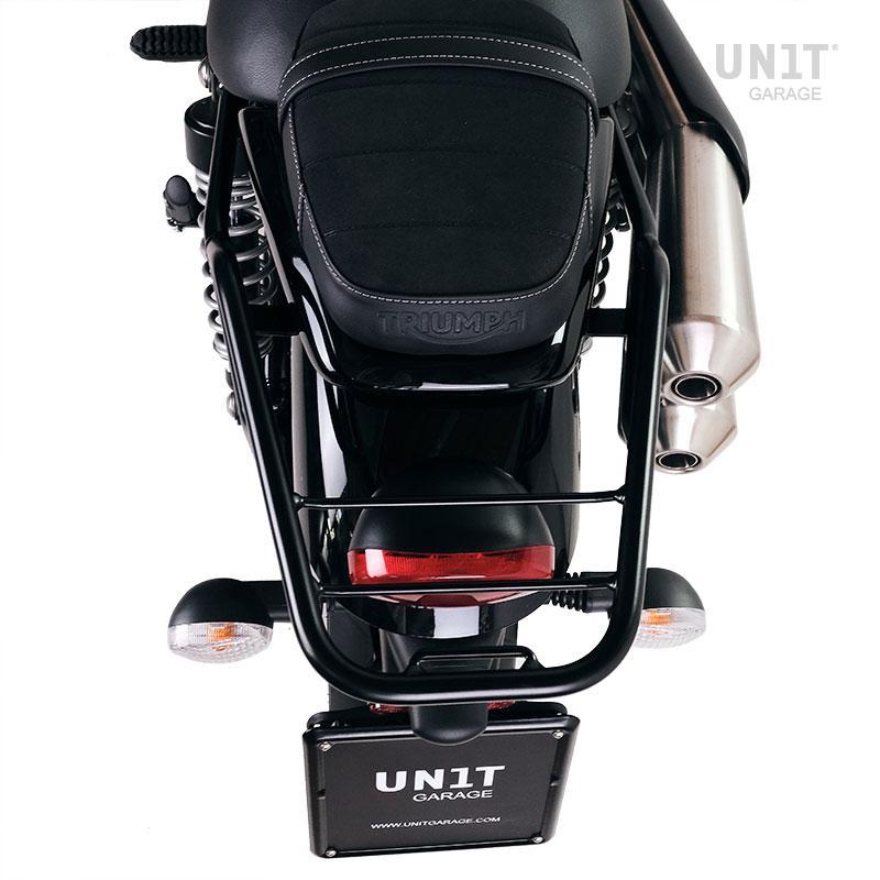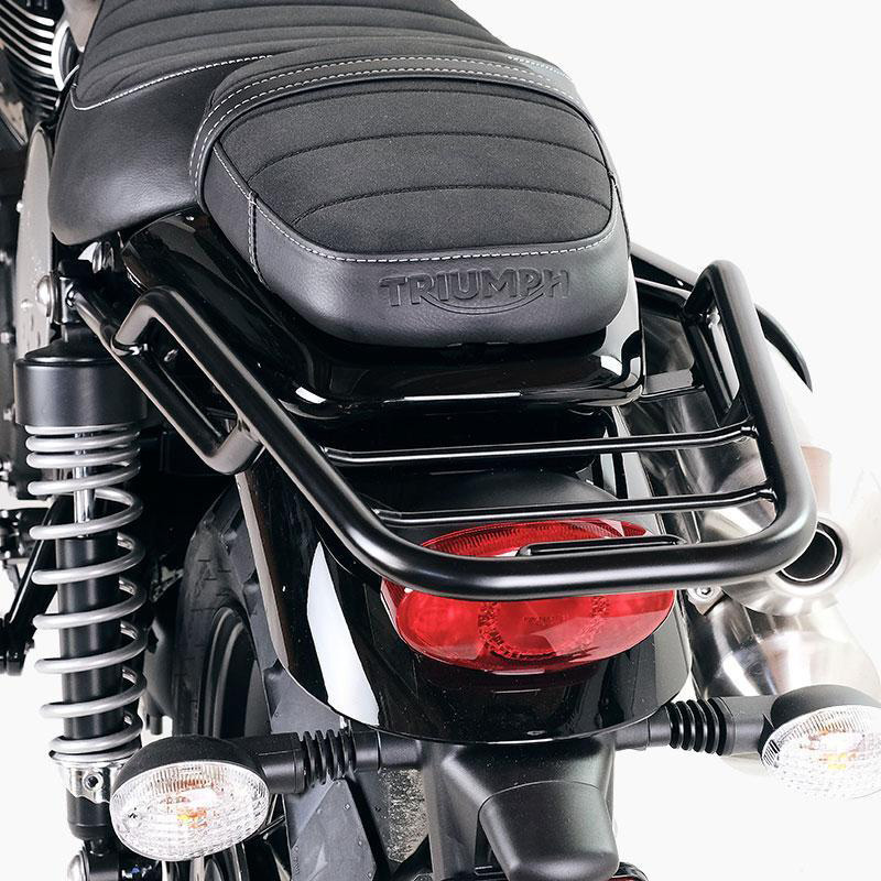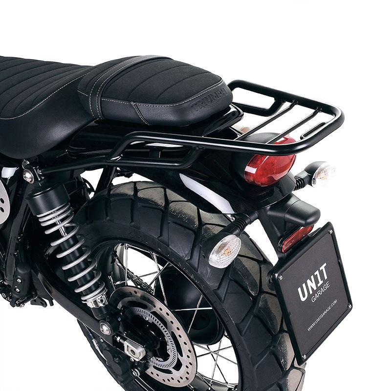 Porte-bagages en tube d'acier finition poudre époxy noir mat. Il complète la partie arrière et est équipé de poignées pour le passager, il se fixe très simplement au cadre en retirant la selle. Robuste et pratique, il améliore l'esthétique de la moto.