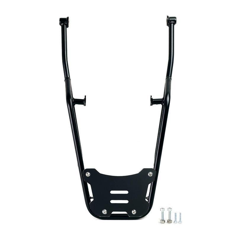 Porte-bagages en tube d'acier avec finition en poudre époxy noir mat. Complète l'arrière et est équipé de poignées pour le passager, il se fixe très simplement sur le vélo d'origine avec les vis fournies. Robuste et pratique, il est pourvu sur la surface d'appui de 4 douilles pour la fixation de la platine AL5 (disponibles séparément ou déjà incluses dans le top case Atlas code : AL3).