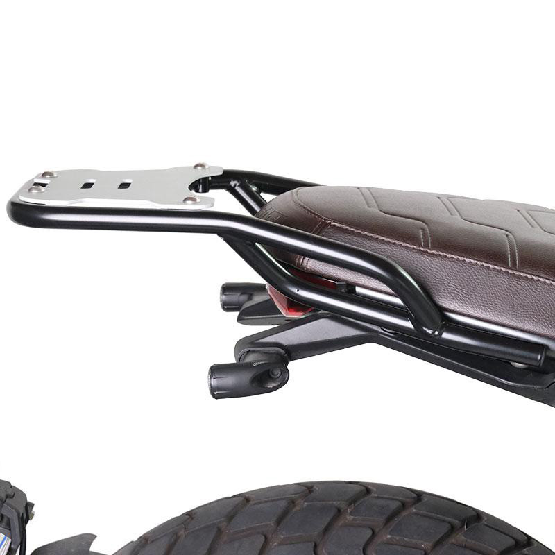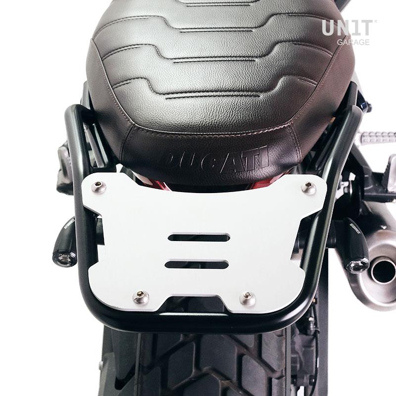 Porte-bagages en tube d'acier avec finition en poudre époxy noir mat. Il complète l'arrière et est équipé de poignées de maintien pour le passager. Il se fixe très simplement au cadre de la moto sur les 4 points de fixation fournis par Ducati.