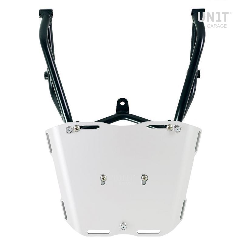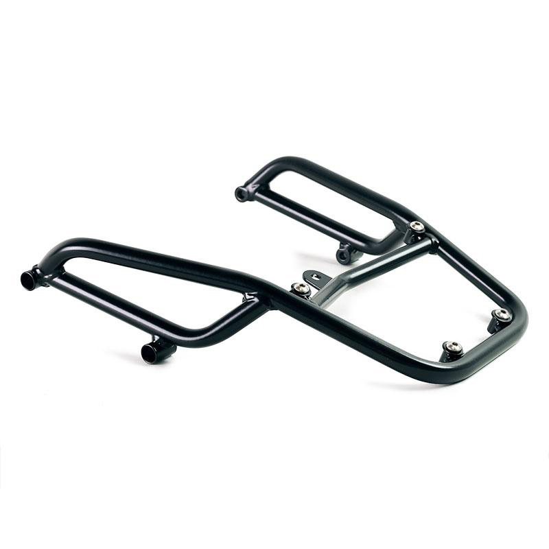 Porte-bagages en tube d'acier finition poudre époxy noir mat. Il complète la partie arrière et est équipé de poignées pour le passager, il se fixe très simplement sur la moto d'origine grâce aux vis fournies. Robuste et pratique, il est équipé sur la surface d'appui de 4 douilles pour la fixation de la plaque code : AL5.