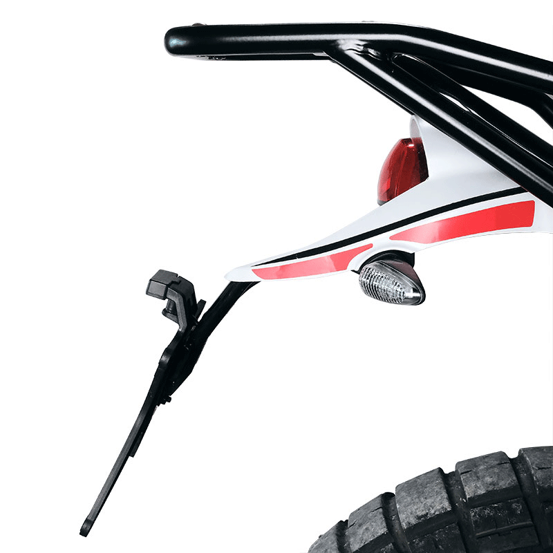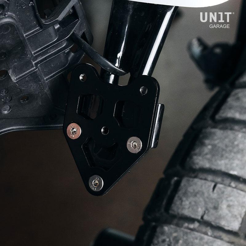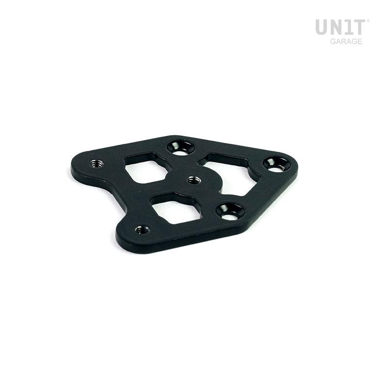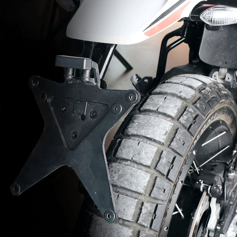 Si vous souhaitez monter la plaque rapidement et facilement sans modifier le câblage, cet accessoire est ce qu'il vous faut. Fabriqué en acier peint à la poudre époxy noire avec des vis de fixation reproduisant les trois trous d'origine, surélevant la plaque d'environ 40 mm. Il se fixe très simplement au cadre de la plaque et permet de modifier sensiblement le caractère et le style du vélo à l'arrière en le raccourcissant et en surélevant la plaque.