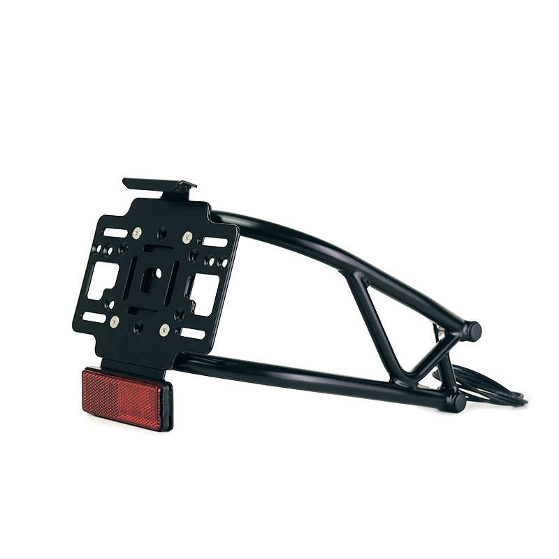 Fabriqué en tube d'acier avec finition en poudre époxy noire mate, il est livré avec un support de plaque d'immatriculation et un réflecteur en aluminium, disponible en deux versions : modèle EU et modèle US. (Choisissez le modèle dans le menu déroulant). Dans le kit, vous trouverez un éclairage de plaque d'immatriculation à LED avec un fil déjà câblé qui passe à l'intérieur du tube et un connecteur compatible avec le système électrique d'origine.