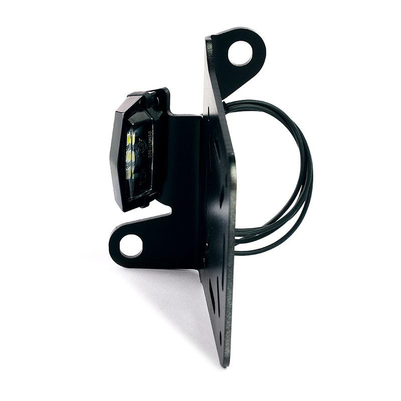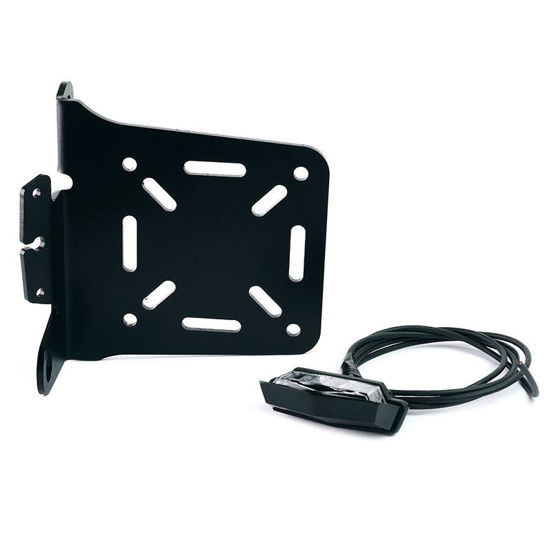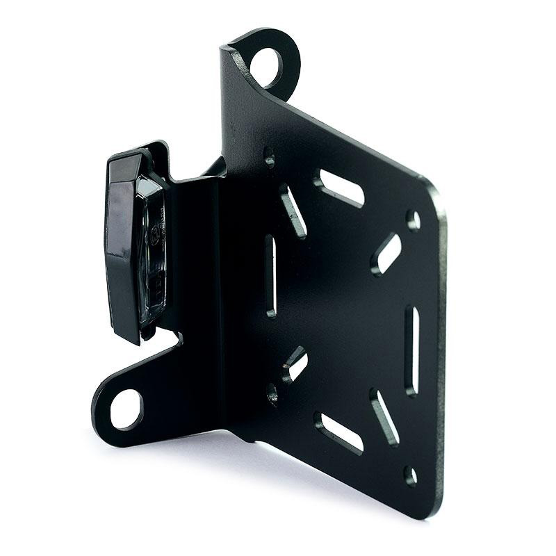 Conçu pour le kit Sportail, ce support de plaque latéral en acier finition poudre époxy noir mat est livré complet avec câblage et éclairage de plaque à LED.