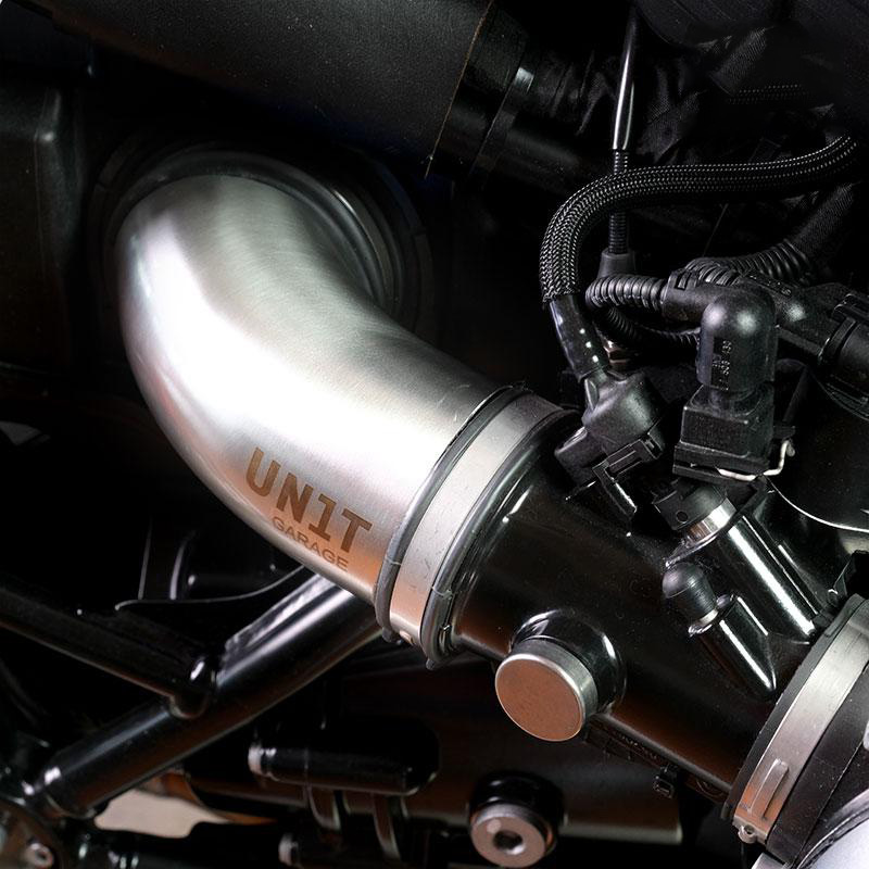 Paire de collecteurs d'admission en acier inoxydable satiné, droite et gauche, avec logo Unit garage.