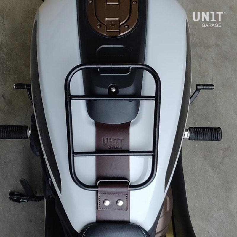Bande de réservoir en cuir pleine fleur et cousue avec du fil de nylon avec système de fixation. Fabriqué à la main en Italie. Il donne au réservoir un style vintage et permet le montage de notre support de téléphone code 1607 ou du sac code 122509_04