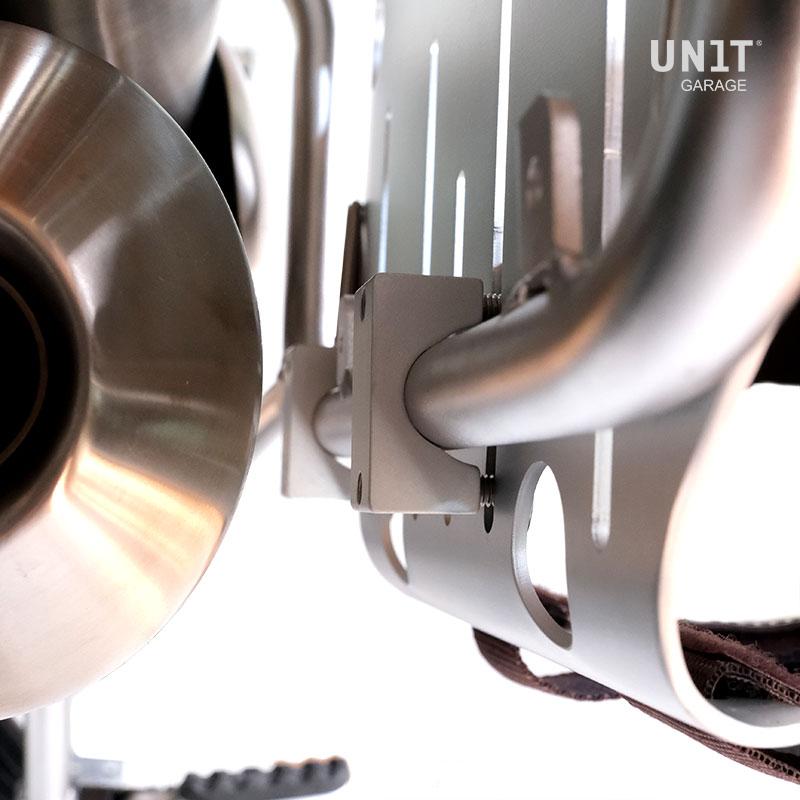 Paire de boulons en U pour la fixation sur des cadres tubulaires d'un diamètre de 14 à 25 mm. CNC usiné en ergal avec anodisation argent avec plaques et vis en acier inoxydable. Entraxe de vis 32 mm, peut également être utilisé pour la fixation de projecteurs ou autres.