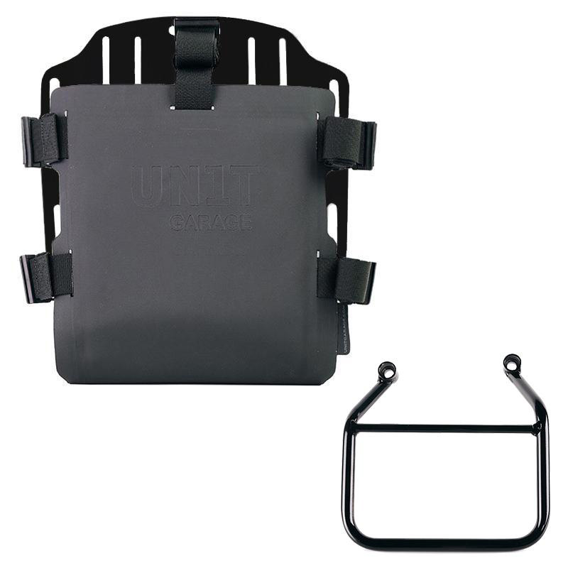 plaque, qui est équipée d'un verrou pour le verrouillage sur le cadre lui-même. La plaque crée une surface de montage plane sur le côté de la moto, cela permettra le transport de sacs sans fixation ou d'autres objets, comme des sacs de couchage, des vestes, etc. Le rabat avant, soigné dans les moindres détails, avec des finitions en Hypalon, peut être réglé à l'aide des curseurs fournis et peut être retiré très rapidement de la plaque.