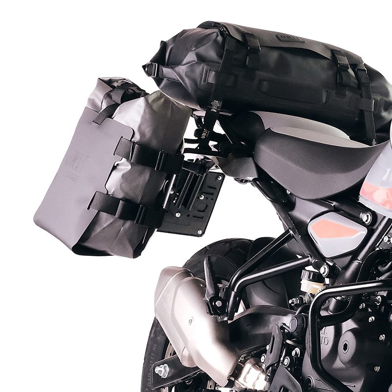 plaque, qui est équipée d'un verrou pour le verrouillage sur le cadre lui-même. La plaque crée une surface de montage plane sur le côté de la moto, cela permettra le transport de sacs sans fixation ou d'autres objets, comme des sacs de couchage, des vestes, etc. Le rabat avant, soigné dans les moindres détails, avec des finitions Hypalon, peut être réglé à l'aide des curseurs fournis et peut être retiré très rapidement de la plaque.