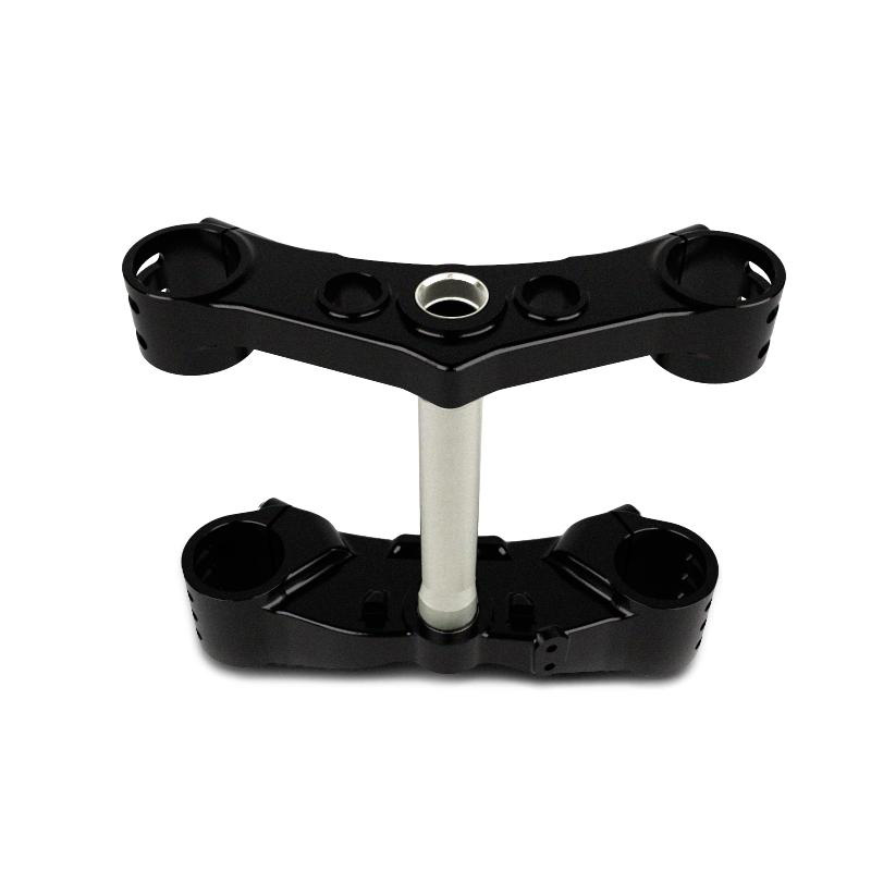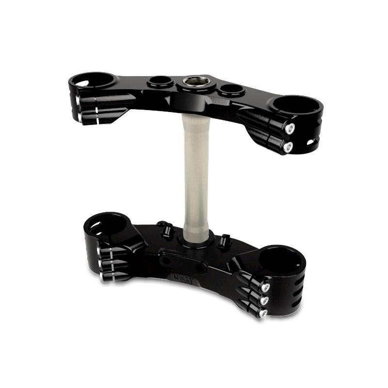 Pour rendre votre R18 plus performante nous avons étudié et testé ce kit complet qui permet le montage d'une fourche Upside Down Ohlins. Le vélo change de caractère et devient beaucoup plus ludique et utilisable sur tout type de chemin. Cela vous permettra d'avoir une suspension de course personnalisée et le confort de conduite sera fantastique. Nous avons mis en place une fantastique fourche Ohlins FG 424 avec des plaques et des pieds conçus ad hoc et usinés du solide à la CNC. Les réglages de compression et de détente se font facilement. Le design des platines et des pieds a été repensé pour rendre toute la façade très "mauvaise", et rendre le tout plug and play. Vous pouvez réutiliser : les étriers d'origine et les vis correspondantes, le support de phare et les rehausseurs de guidon d'origine, la tête de direction, les écrous de serrage et les roulements.