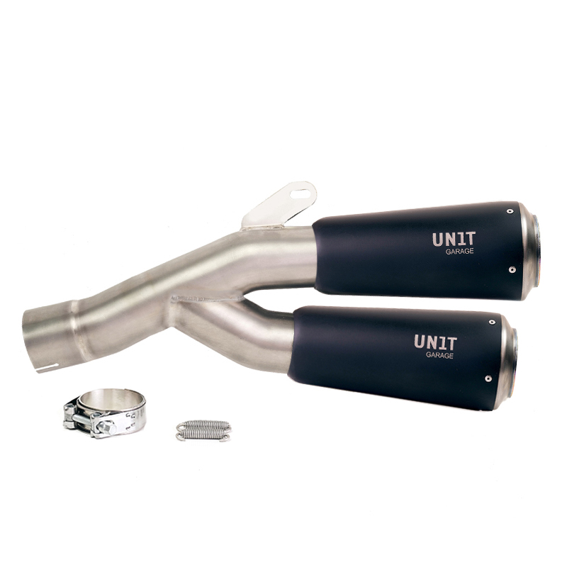 Silencieux en titane et raccord en acier inoxydable travaillés entièrement à la main, dans un parfait style moto gp.