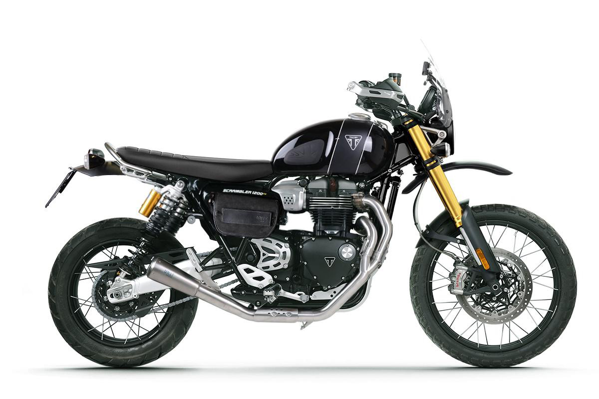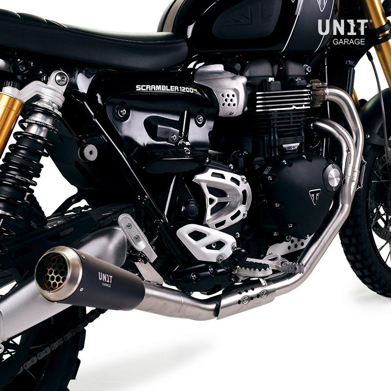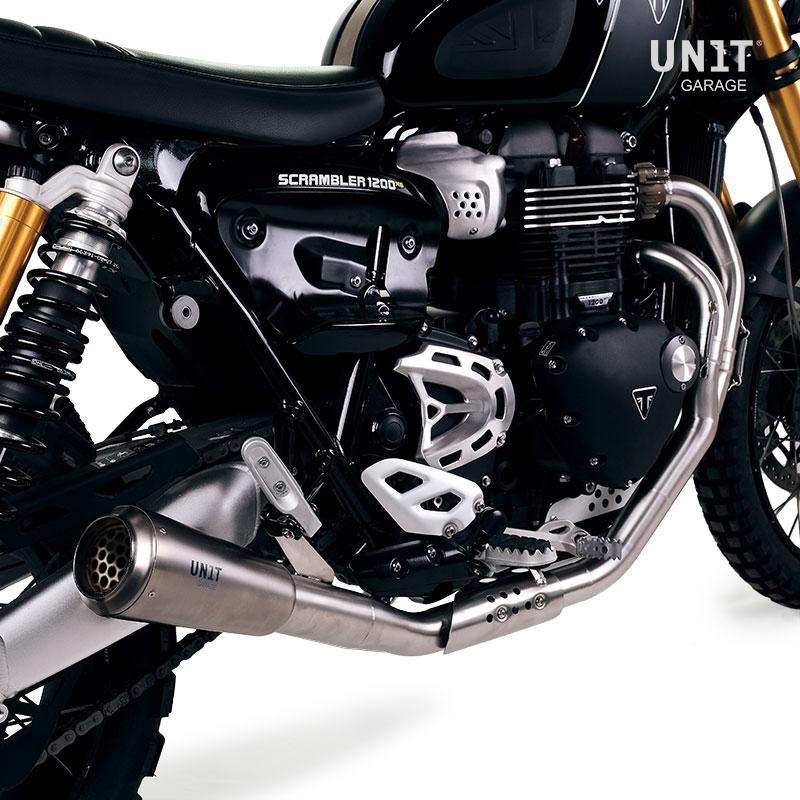 Sur la Triumph 1200 scrambler le double échappement haut est très sympa mais la chaleur dégagée est remarquable, votre jambe droite en sait quelque chose :). Pour surmonter ce problème et rendre la moto plus utilisable, nous avons créé ce pot d'échappement bas. Collecteurs en acier inoxydable sans pot catalytique et silencieux en titane entièrement travaillés à la main, dans le parfait style GP. Il pèse environ 6 kg de moins que celui d'origine. Il se monte facilement sans apporter de modifications à la moto. Lorsque vous montez le pot d'échappement bas sur votre Triumph XC - XE et que vous souhaitez finir l'écart créé sur le côté, nous vous recommandons de le combiner aveccodes U037+A17 ou U038+A17
