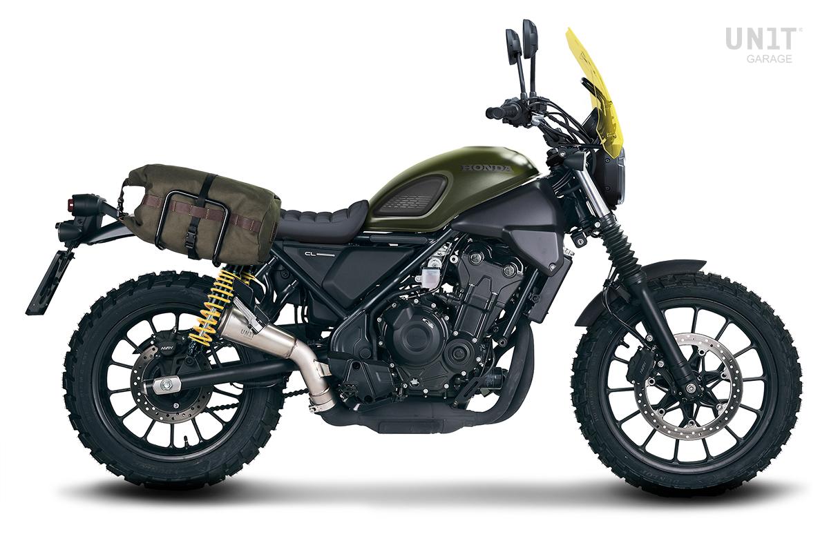 Pour la Honda CL nous souhaitions un échappement spécial, mais idéal pour un usage routier ! Silencieux en titane et raccord en acier inoxydable travaillés entièrement à la main, dans un parfait stile moto gp. Il pèse environ 5 kg de moins que l'original (6,7 kg). Il peut être facilement assemblé en quelques minutes grâce au support inclus. Le son vous rendra fou et la prestation... aussi!