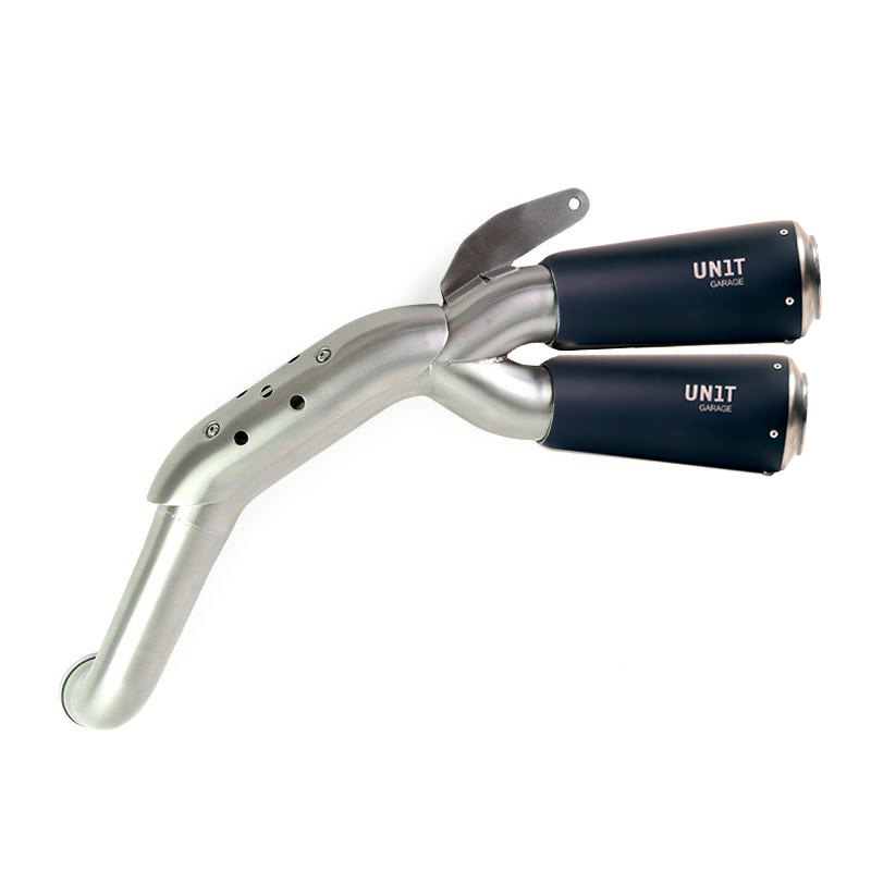 Raccord avec protection en acier inoxydable et deux silencieux en titane travaillés entièrement à la main.