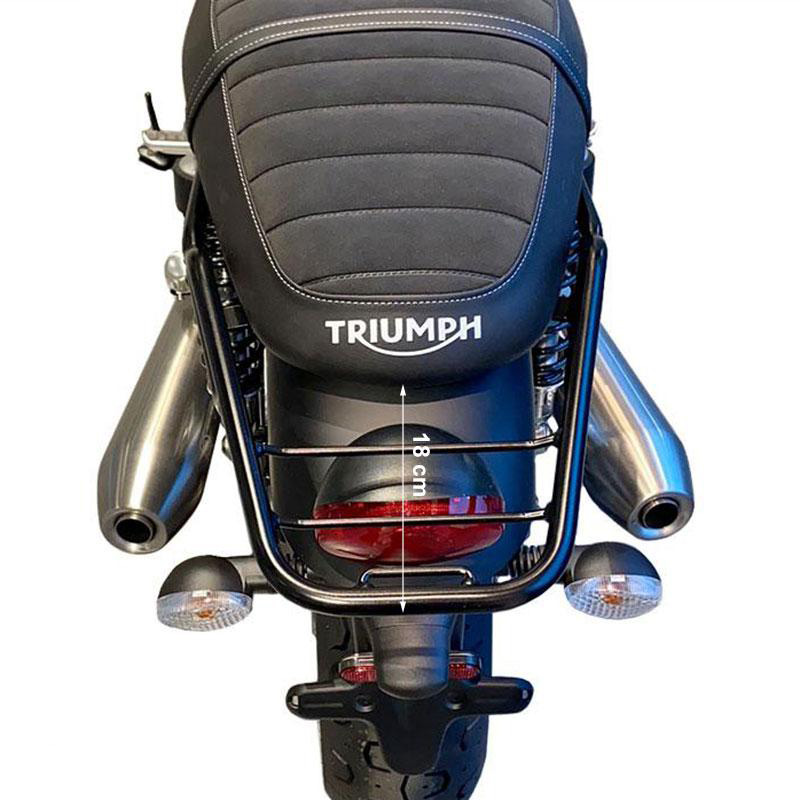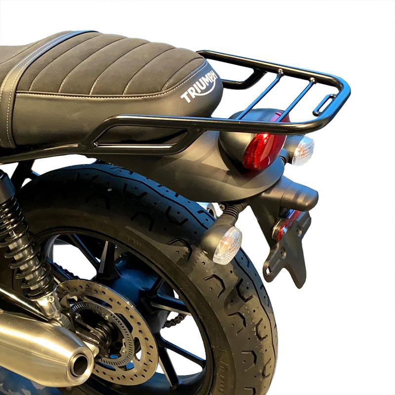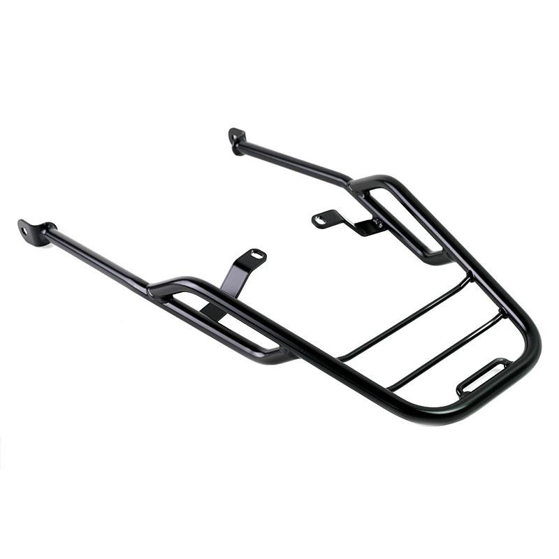 Porte-bagages en tube d'acier finition poudre époxy noir mat. Il complète la partie arrière et est équipé de poignées pour le passager, il se fixe très simplement au cadre en retirant la selle. Robuste et pratique, il améliore l'esthétique de la moto.