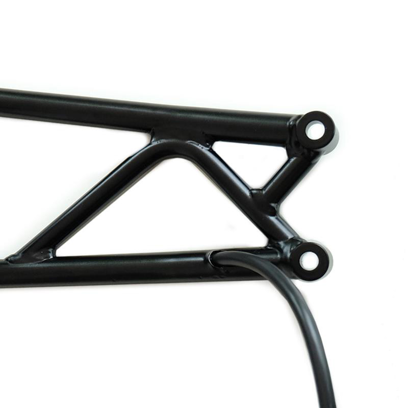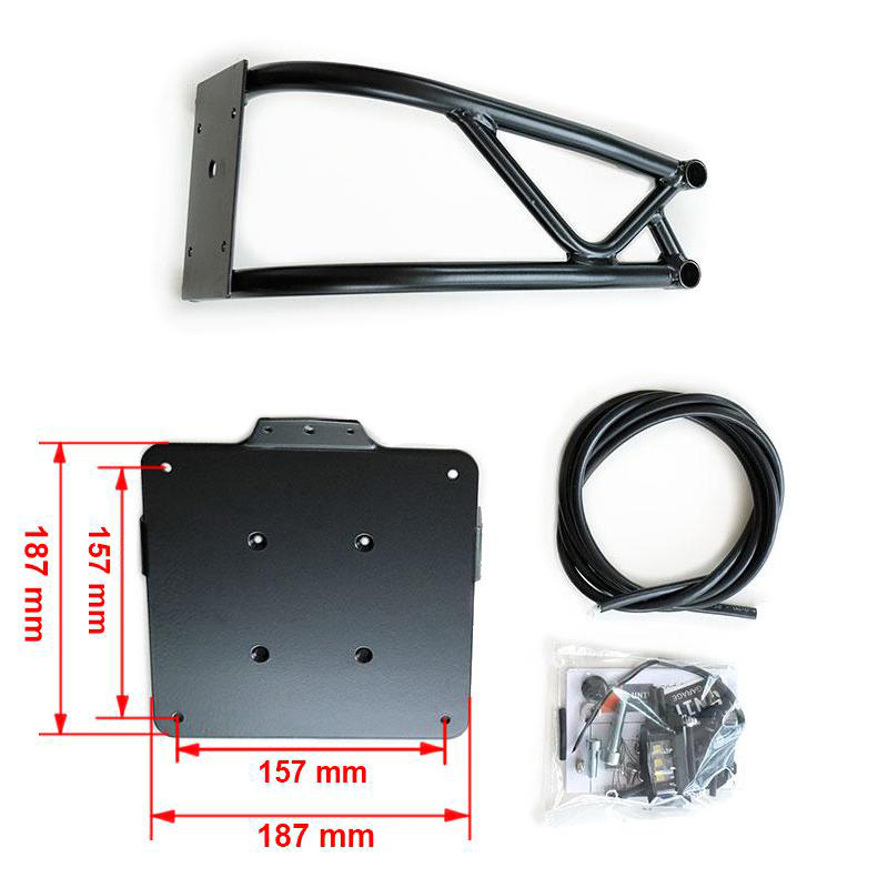 Fabriqué en tube d'acier avec finition en poudre époxy noir mat avec support de plaque d'immatriculation en aluminium avec supports pour flèches d'origine ou de rechange (flèches non incluses). Il est fourni avec éclairage de plaque d'immatriculation à led. L'extension du faisceau de câblage pour le phare et les clignotants est incluse, le fil passe à l'intérieur du tube. Dimensions du support de plaque d'immatriculation : 187 x 187 mm