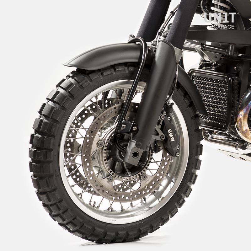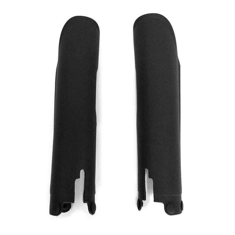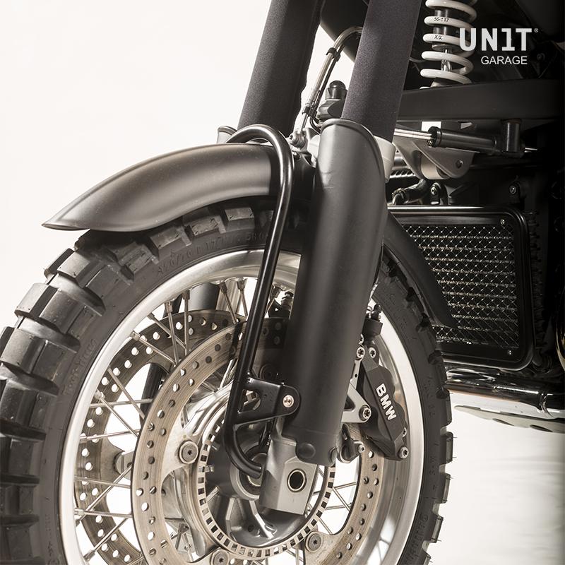 Des protections en plastique robuste et peintes avec un fini noir mat et transparent protègent les couvre-fourches comme sur les vélos enduro.