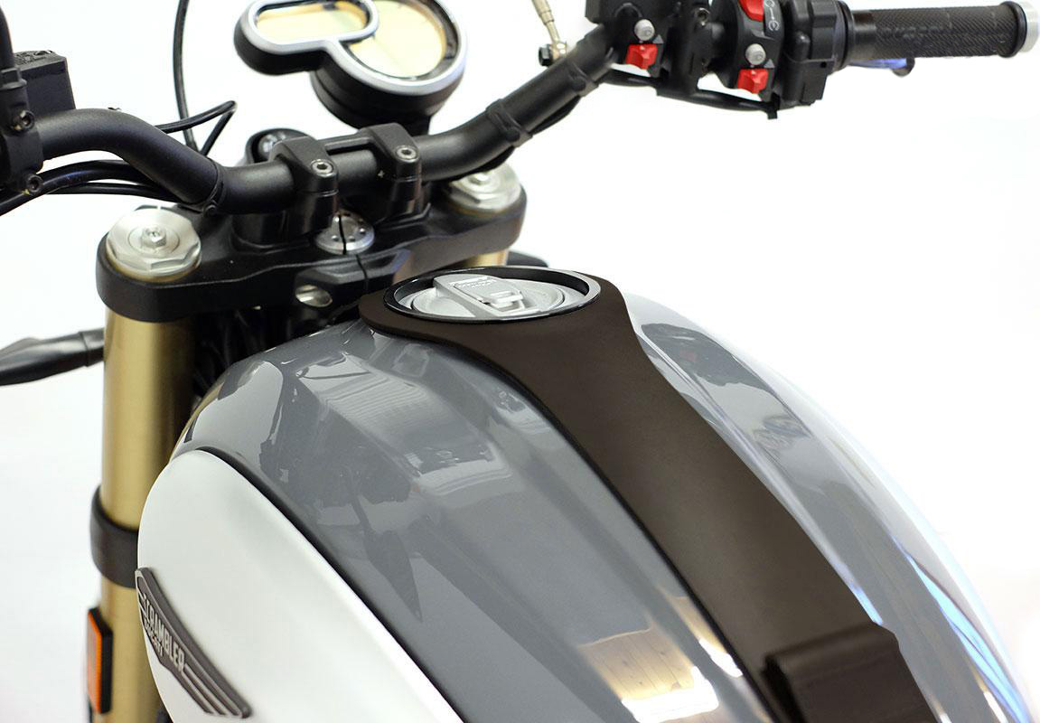 Il est livré avec des crochets au réservoir et une protection pour éviter d'endommager la peinture d'origine. Dans la partie arrière, il permet le logement du porte-réservoir et d'autres accessoires.