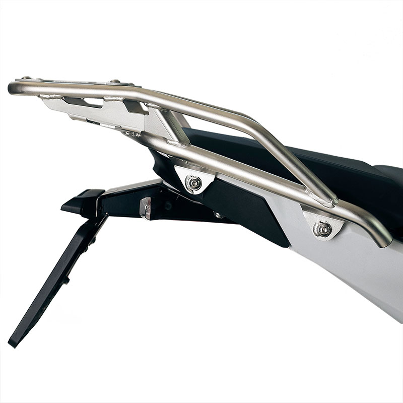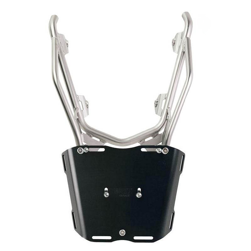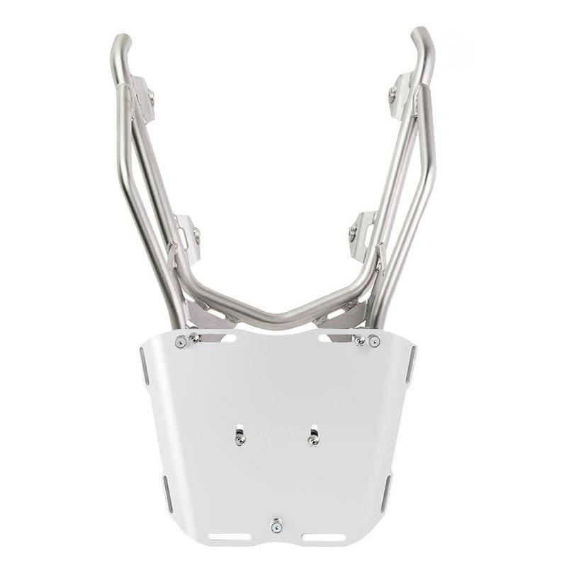 3. Porte-bagages renforcé en acier inoxydable conçu pour la fixation de plaques d'immatriculation ou d'un top case (couleur argent)