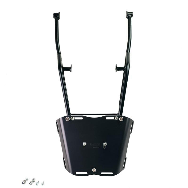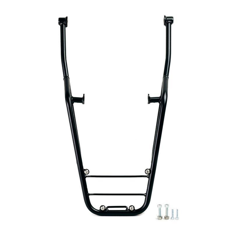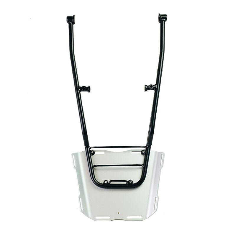 Porte-bagages en tube d'acier avec finition en poudre époxy noir mat. Complète l'arrière et est équipé de poignées pour le passager, il se fixe très simplement sur le vélo d'origine avec les vis fournies. Robuste et pratique, il est pourvu sur la surface d'appui de 4 douilles pour la fixation de la platine AL5.