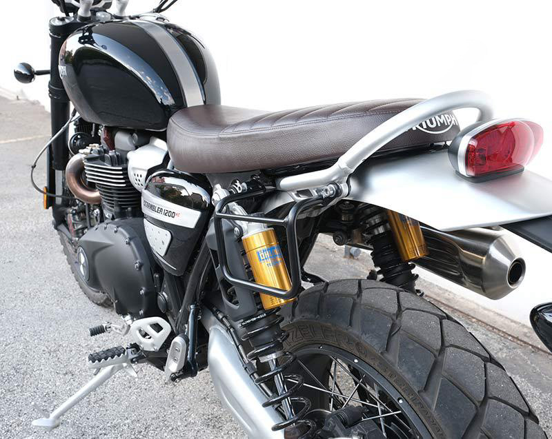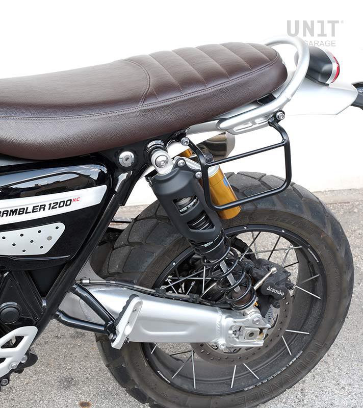 Conçu sur le cadre Triumph, il s'intègre parfaitement au reste de la moto. Prêt à accueillir notre système d'attache rapide, beau et minimal même lorsque le sac n'est pas monté. Il peut être utilisé confortablement avec le passager à bord.
