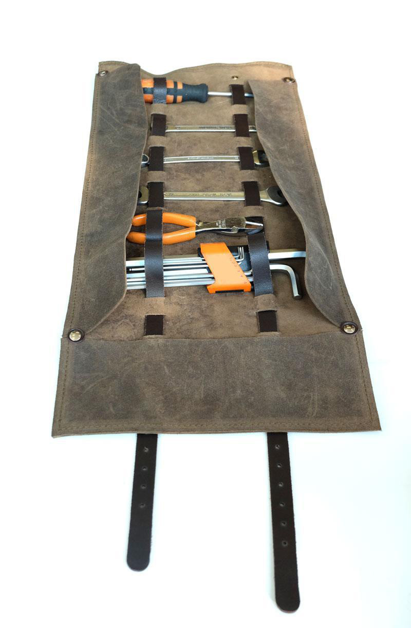 Au début, nous avons pensé à un robuste rouleau d'outils en croûte de cuir ciré,